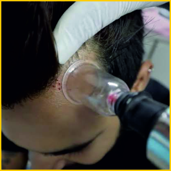 Cupping therapy uses a vacuum force established behind a small vessel applied to the surface of the skin as its therapeutic technique.